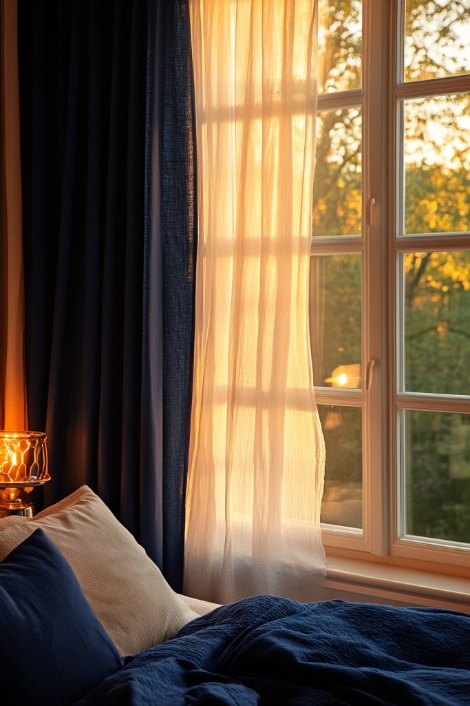 Opt for blackout navy curtains if you need more privacy or better sleep. For a lighter, airier look, choose semi-sheer fabrics in navy or deep indigo. Layer curtains with sheer panels or add tiebacks for versatility. Change the lighting color temperature—warm whites for intimacy or cooler tones for a modern edge.