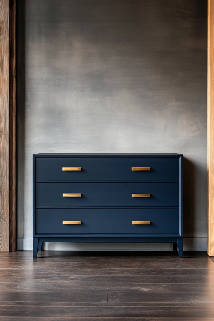 Visualize a sleek navy dresser with a matte finish, accented by shiny brass knobs and pulls. The hardware catches the light, offering a subtle luxe vibe. The dresser’s bold color anchors the room, contrasting beautifully with lighter walls and bedding. It’s both practical and eye-catching, making it the room’s centerpiece.