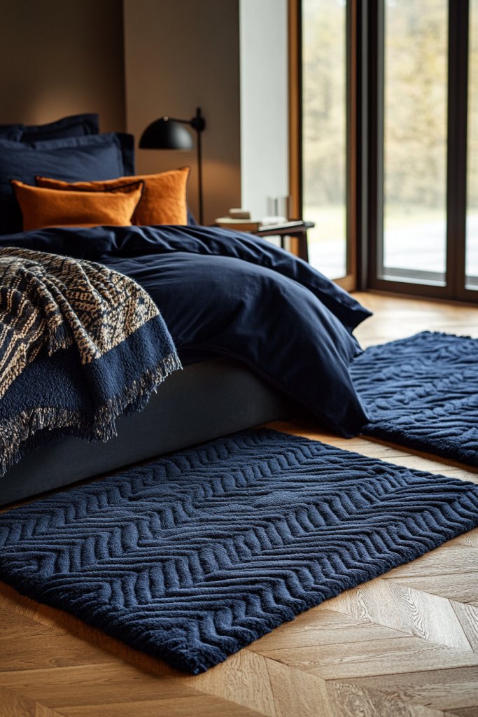 Feeling the chill or tired of plain flooring in your bedroom? Layered navy blue rugs add warmth, texture, and a sense of luxury under your feet. They also define different zones within your space, making the room feel more inviting and styled. It’s one of those small touches that make a big difference.