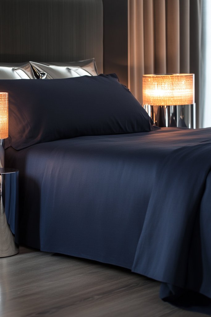 Imagine crisp navy sheets topped with a matching navy duvet, accented by metallic lampshades in silver or chrome. The reflective surfaces catch the soft light, bouncing brightness around the room. The cool metal tone contrasts beautifully with the deep blue, adding a modern, luxe touch. The lighting casts a gentle glow on textured bedding and wall surfaces, creating a cozy yet glamorous ambiance.