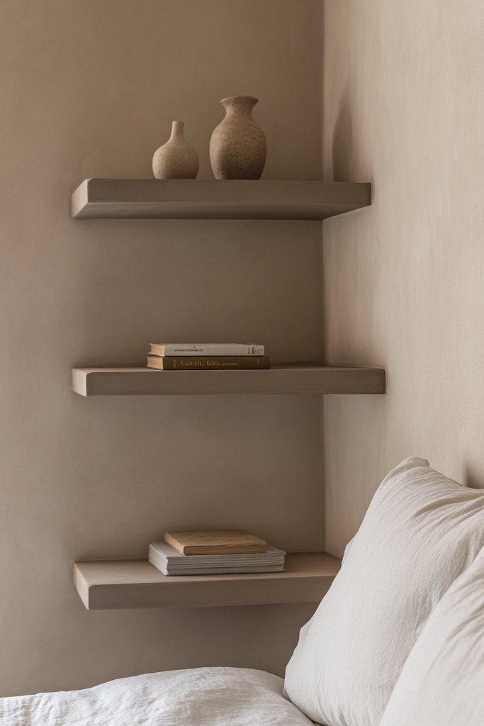 Clutter can turn a peaceful bedroom into a chaotic mess. But bulky storage furniture often disrupts a minimalist look. Built-in or floating shelves provide practical storage while maintaining a sleek, open feel that complements a neutral aesthetic.