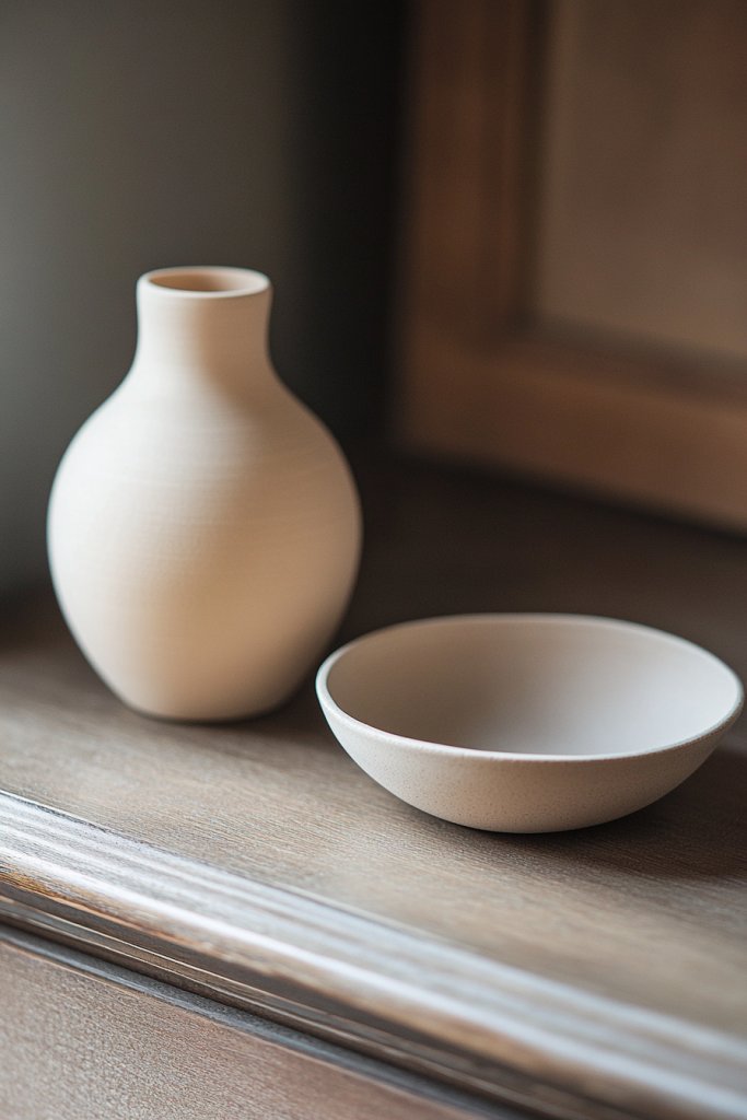 Picture a matte ceramic bowl in soft gray sitting atop a dresser, holding smooth stones or textured potpourri. Or a slender, neutral-toned vase with a dried floral arrangement or minimalist twig branch. These pieces add a sculptural element to your decor, offering tactile and visual balance. The muted colors blend seamlessly into your neutral theme, elevating your space without overpowering it.