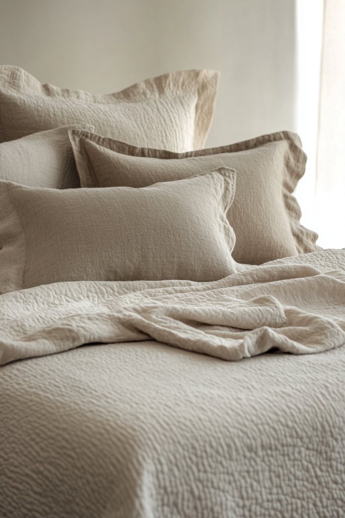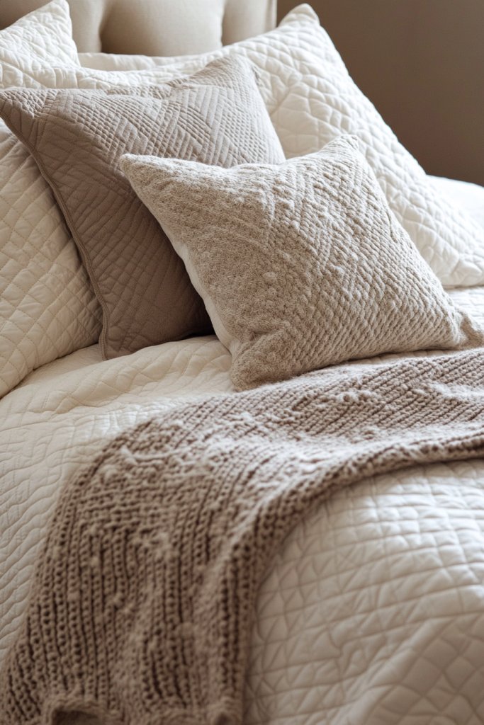 Mix textures—think quilted, knitted, ribbed, or embroidered fabrics—in shades of gray, taupe, or cream. Use lightweight quilts for summer and heavier, textured throws for winter. Incorporate tactile pillows with different weaves or quilting patterns to add visual interest. Keep the color palette neutral for a harmonious, calming effect.
