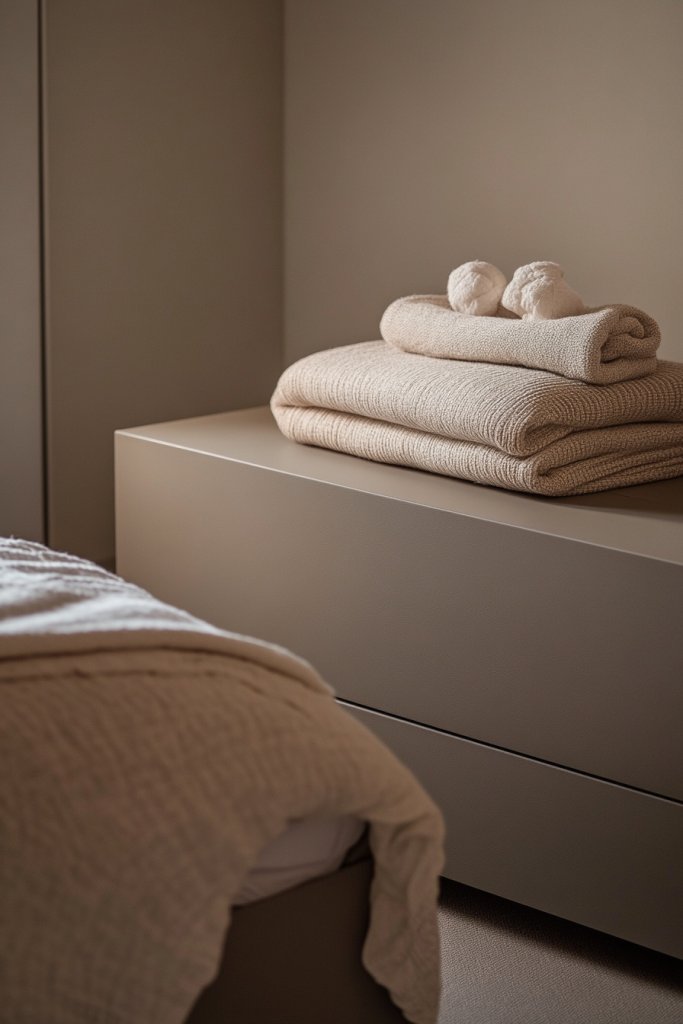 Imagine woven baskets in soft gray resting on open shelves, or sleek, matte-finished chests tucked under the bed. These storage options hide away everyday items while blending seamlessly into your neutral decor. The result is a tidy, serene environment where everything has its place, and nothing feels out of place. It’s like a zen retreat in your home.