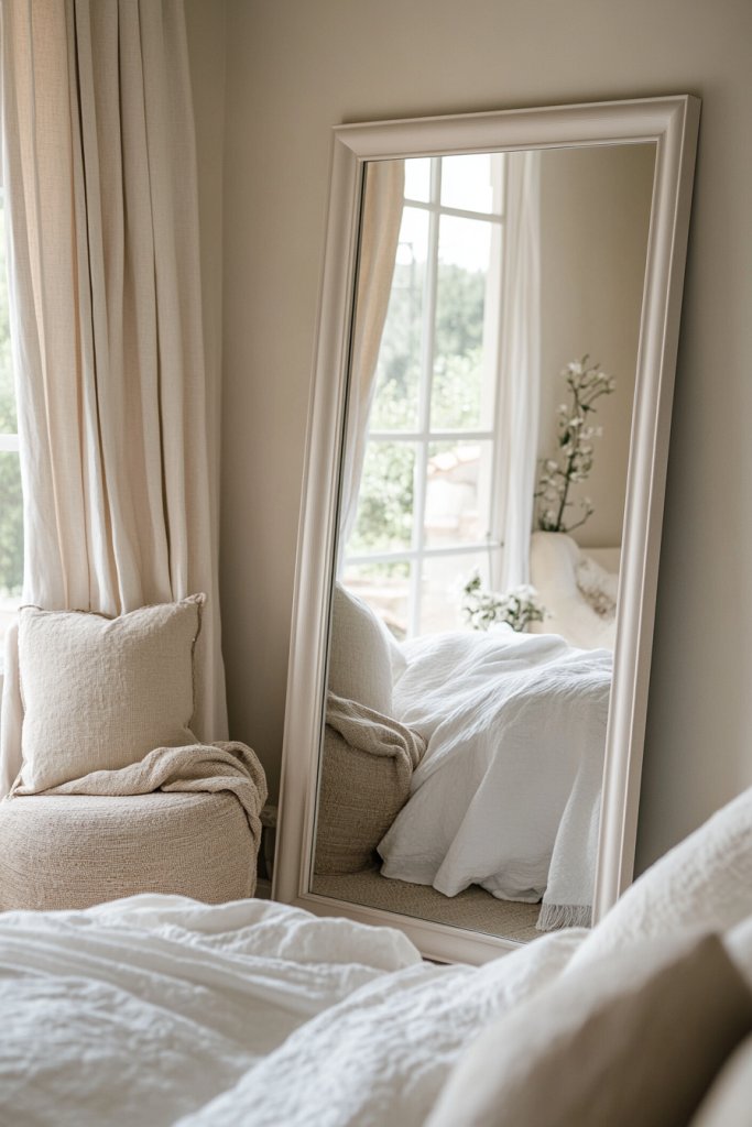 Picture a large, frameless mirror leaning against a wall or a sleek mirror with a matte black or brushed brass frame. It captures the soft tones of your room, creating an illusion of more space and bouncing natural light around. When positioned strategically, it enhances the overall aesthetic, making your bedroom feel brighter and more expansive.