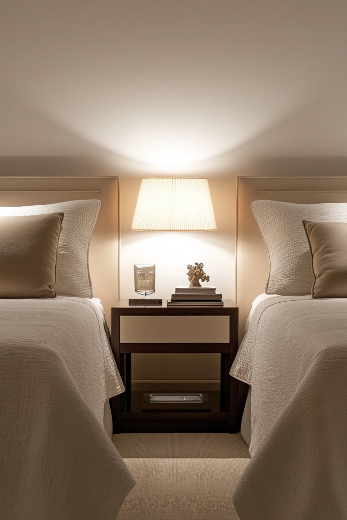 Imagine soft glow from wall-mounted sconces in matte black or brushed brass, positioned on either side of your bed. The warm light casts gentle shadows, emphasizing the room’s tranquil vibe. Alternatively, a sleek table lamp with a fabric shade offers ambient illumination without overpowering the space. The warm hue of the bulbs makes everything feel cozy and welcoming.
