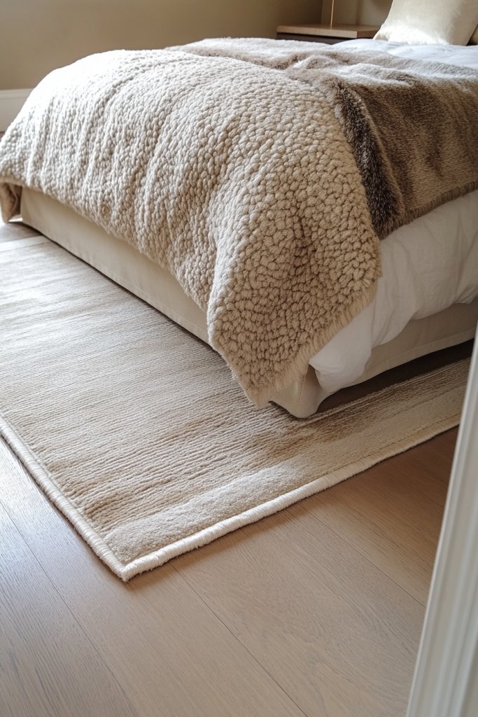 Ever notice how a room feels instantly warmer with the right rug? Bare floors can make a bedroom feel cold and uninviting. Layering neutral area rugs adds both comfort and visual depth, transforming your space into a cozy haven you’ll love to lounge in.
