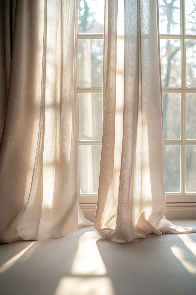 Imagine flowing, floor-length curtains in a light beige or soft gray fabric that pool slightly on the floor. The fabric catches the light softly, adding a whisper of texture to your windows. When drawn, they diffuse sunlight, bathing your room in a warm, even glow. When open, they frame your view, making your windows look like art pieces.