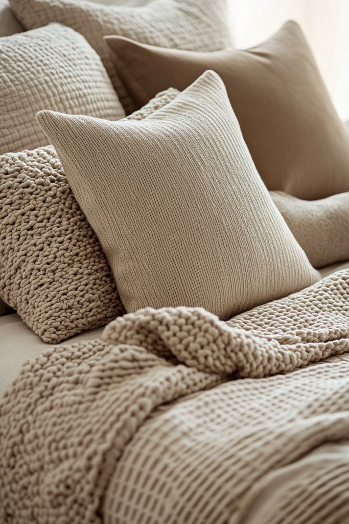 Imagine a bed adorned with pillows in various textures—smooth linen, chunky knits, and soft velvets—all in shades of beige, taupe, and gray. A textured throw in a matching hue drapes casually over the foot of the bed. The mix of materials and shades creates a layered, inviting visual that feels both curated and cozy. It’s like a curated magazine spread come to life.