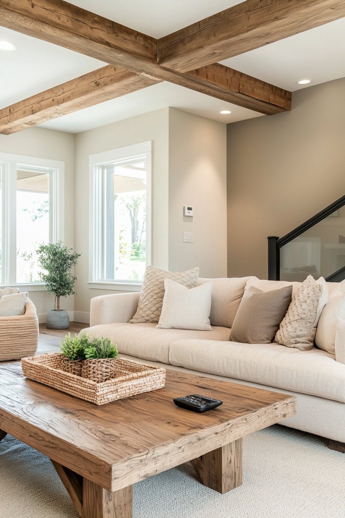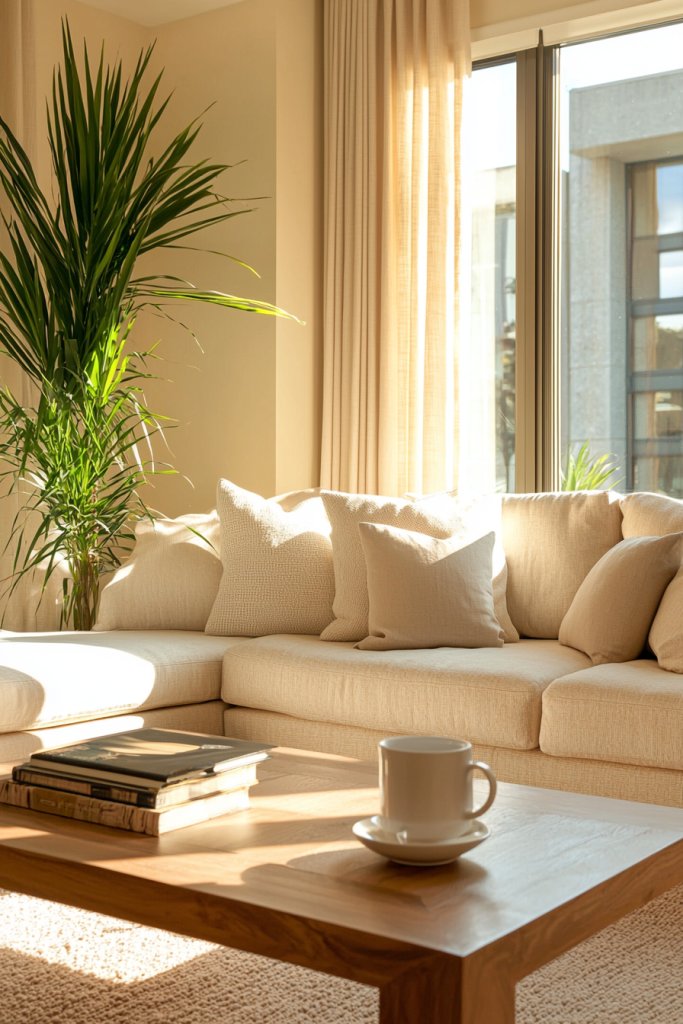 For a splash of contrast, consider adding deep ocean blues or soft greens through throw pillows or artwork, reminiscent of the sea. To finish the look, use plants like succulents or ferns in terracotta pots, grounding the room in earthy tones. With sandy hues and natural accents, your living room will feel like a peaceful retreat, inviting relaxation and harmony into your home.