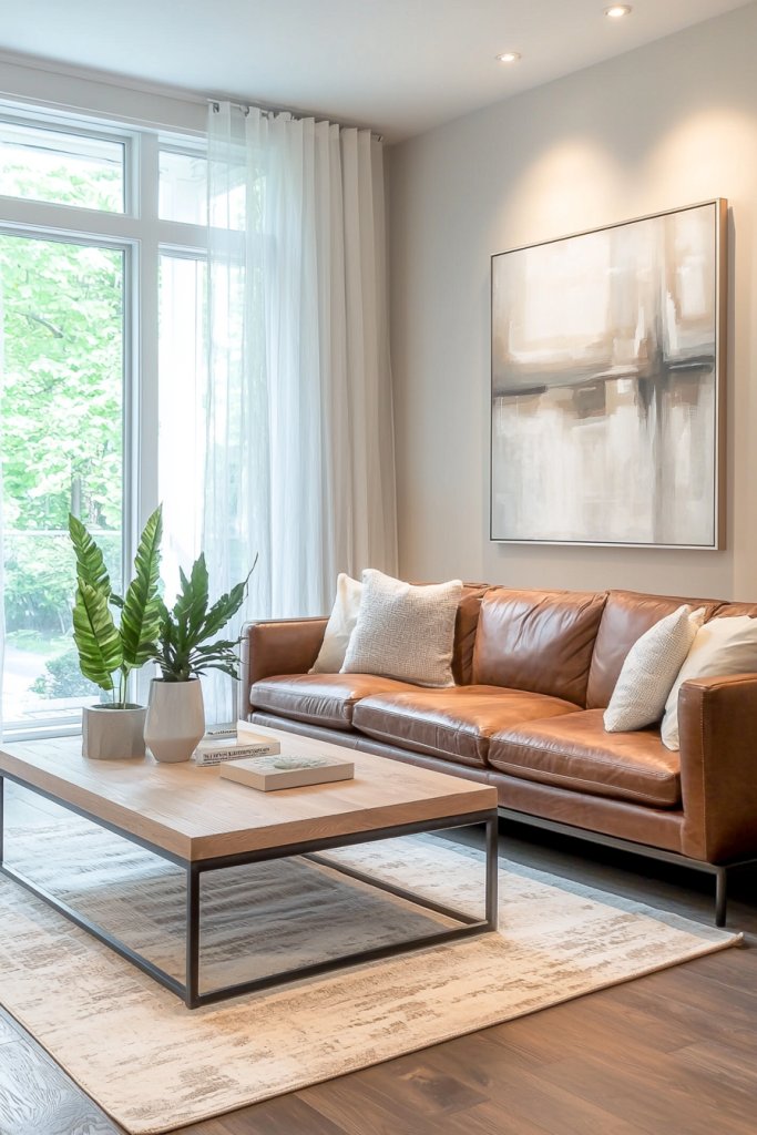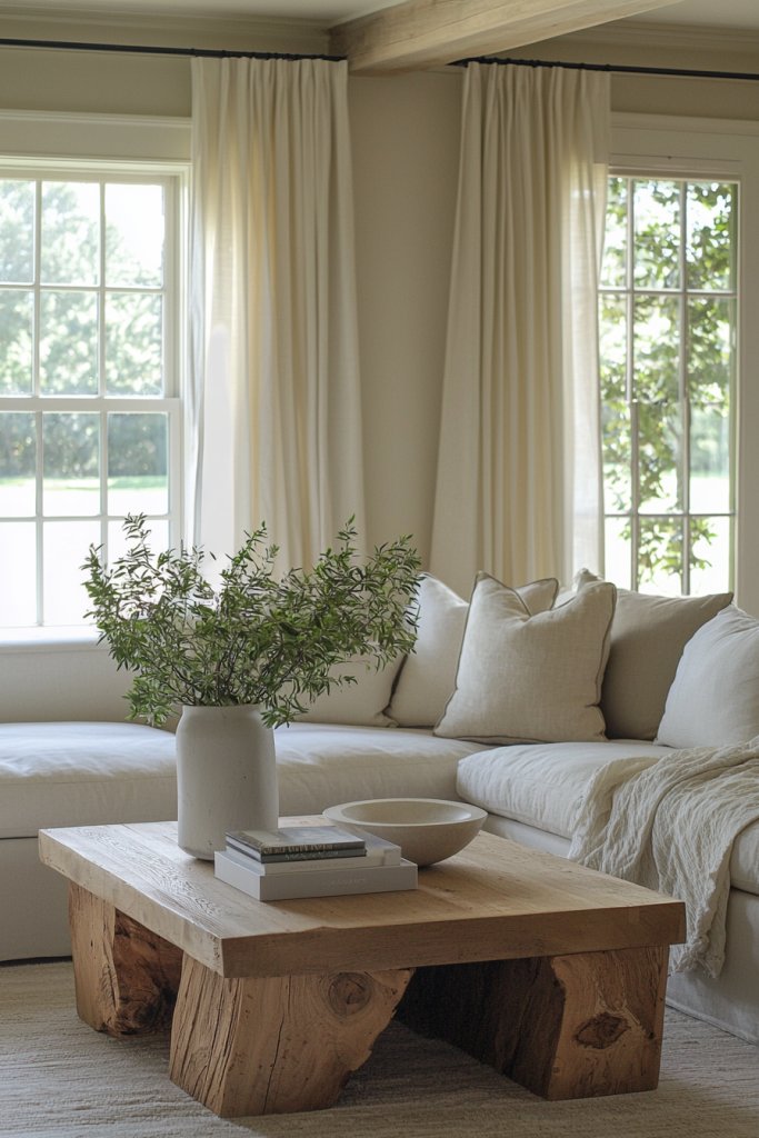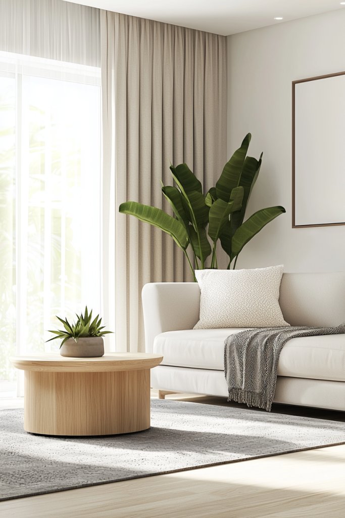 Incorporate creamy wood finishes for furniture, like a light oak coffee table or a whitewashed bookshelf, to enhance the serene vibe. Add layers with varying textures—perhaps a knitted throw paired with smooth leather.