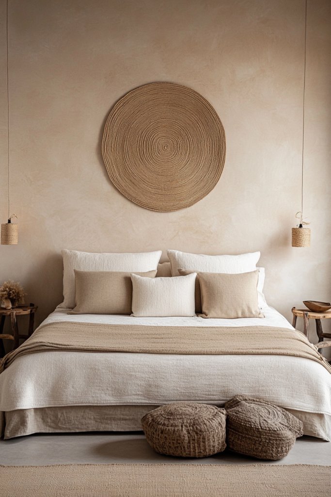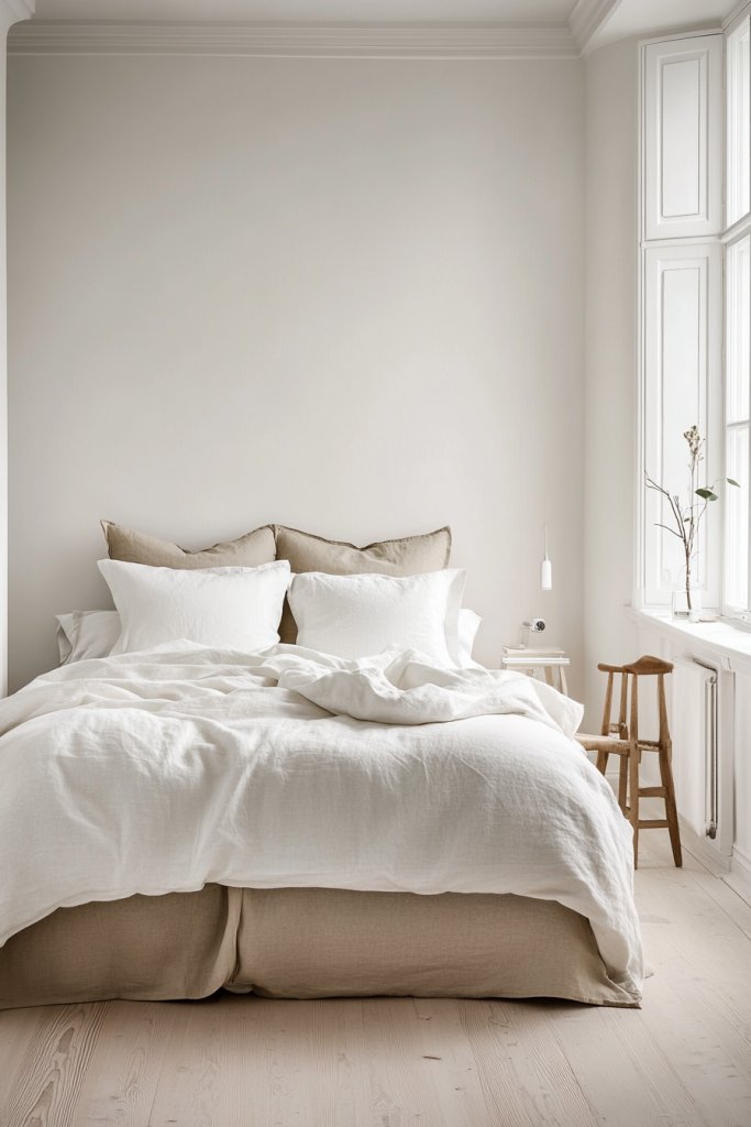 Imagine a bed dressed in crisp white linen sheets, paired with a textured cotton duvet cover in oatmeal tones. A chunky knit throw in neutral hues drapes over the foot of the bed, adding visual depth. The natural wrinkles in linen add a relaxed, lived-in feel that’s both effortless and stylish. Soft, plush pillows in matching tones complete the cozy look, making the bed the ultimate comfort zone.