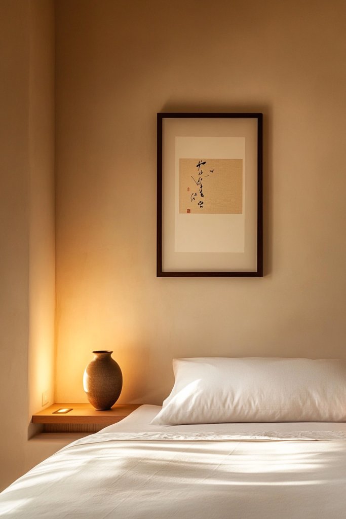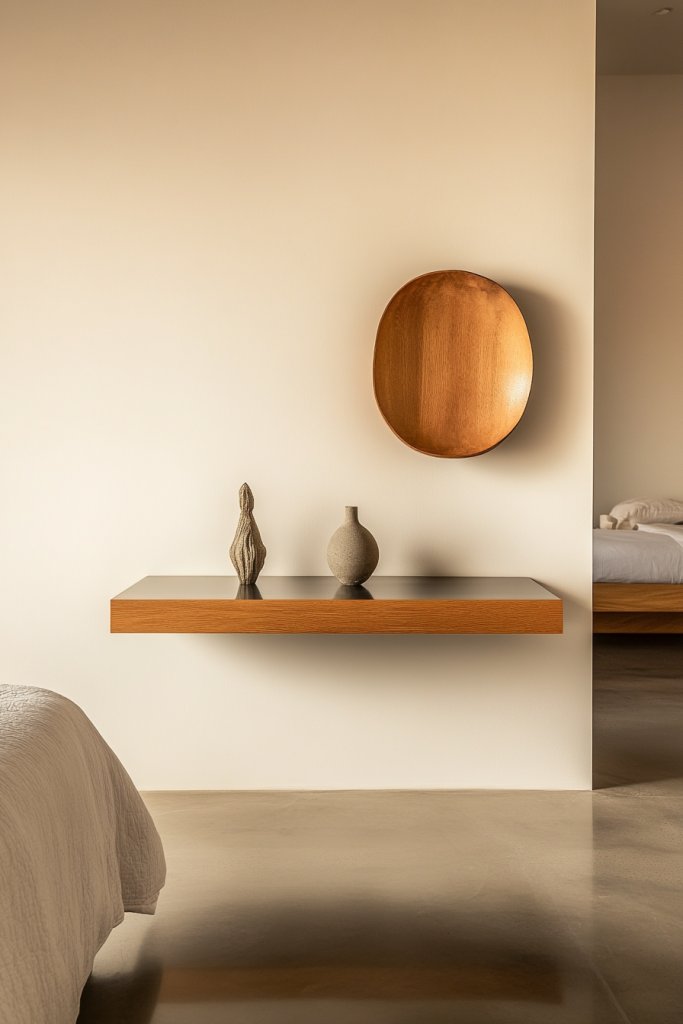 Imagine a wall with a floating shelf holding a few carefully curated objects—like a sculptural piece or a decorative box—keeping surfaces clear. A set of slim wall-mounted cabinets offers storage without crowding the room. The walls are kept mostly bare, with only a few understated accessories or soft lighting to create a serene, organized vibe. This setup emphasizes openness and simplicity.