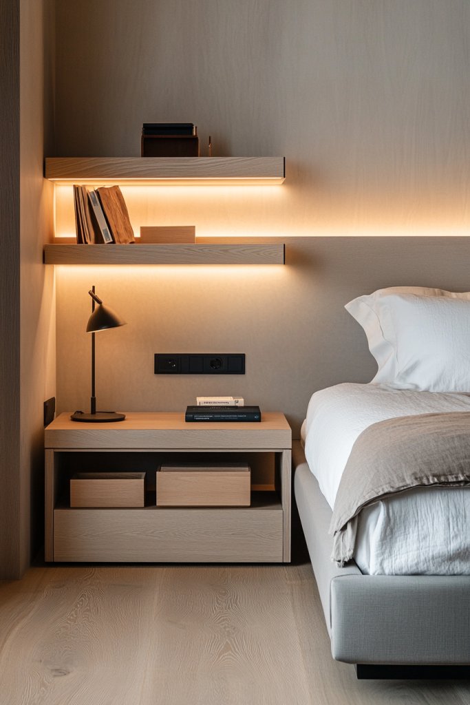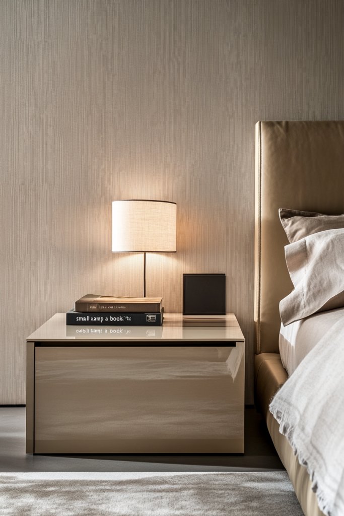 Select nightstands with built-in drawers or concealed compartments for hiding away clutter. Securely attach floating models to the wall to save space and add a modern touch. Keep the top surface minimal—perhaps a small clock or a folded textile—and avoid overload. Regularly tidy to maintain the sleek, minimalist appearance.