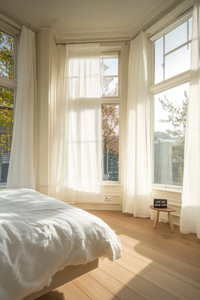 Envision sheer, white linen curtains fluttering softly as sunlight streams in, illuminating the room’s neutral tones. The windows are left mostly bare or fitted with minimalistic shades that can be easily rolled up. The natural light dances across textured bedding and wooden accents, enhancing their warmth and depth. This setup creates an open, fresh atmosphere that feels like a breath of fresh air every morning.