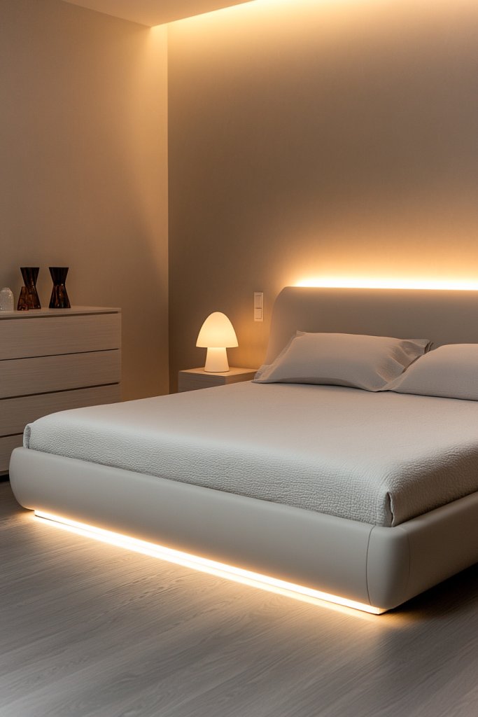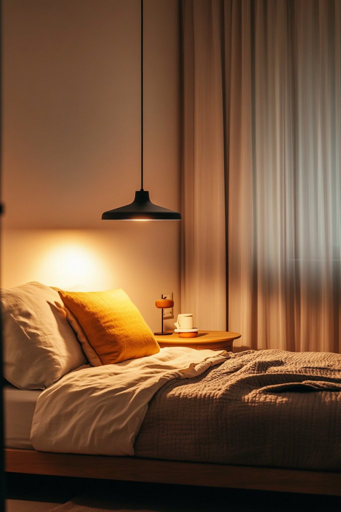 Imagine a bedroom lit by a minimalist pendant light hanging over the bedside table, casting a gentle, warm glow. Or picture a sleek table lamp with a matte finish, placed on a low nightstand. The light softly highlights textured bedding and wooden accents, enhancing their warmth and creating a layered lighting effect. This setup transforms the room into a cozy retreat perfect for winding down.