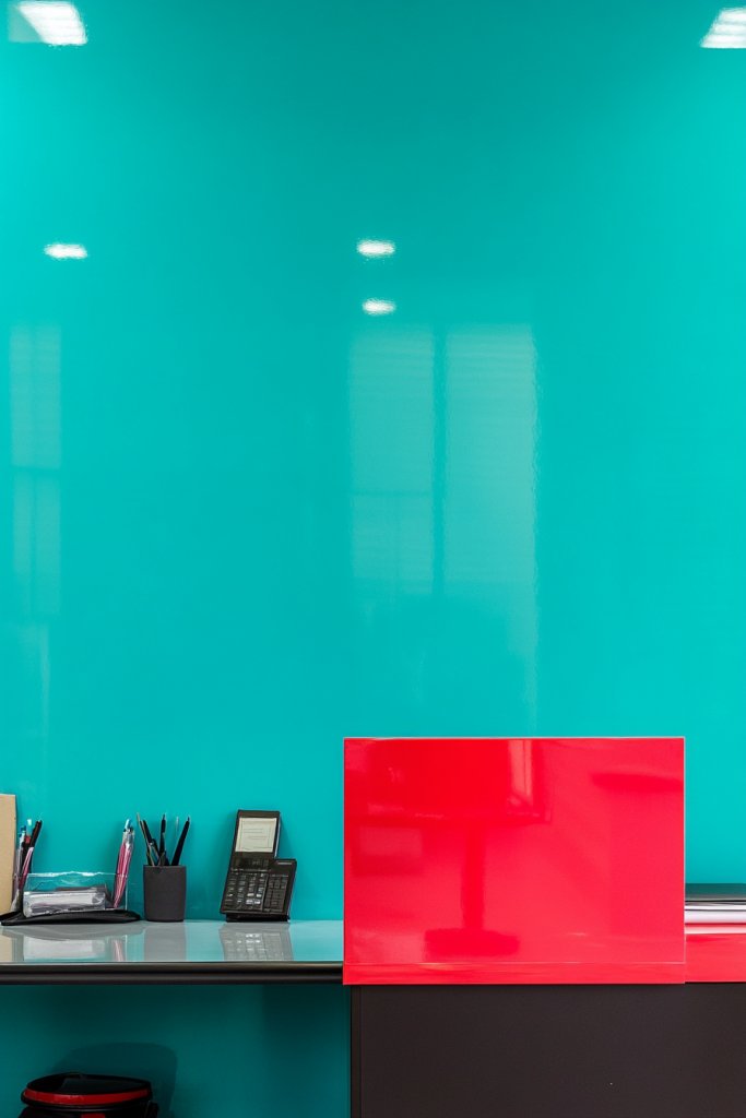 Imagine a wall painted in a vibrant teal, coral, or mustard, with a glossy finish that catches the light from multiple angles. The sheen creates a sleek, modern look that’s both vibrant and sophisticated. When illuminated, the high-gloss surface pops, adding depth and a sense of movement. It’s like giving your office a fresh, energetic facelift.