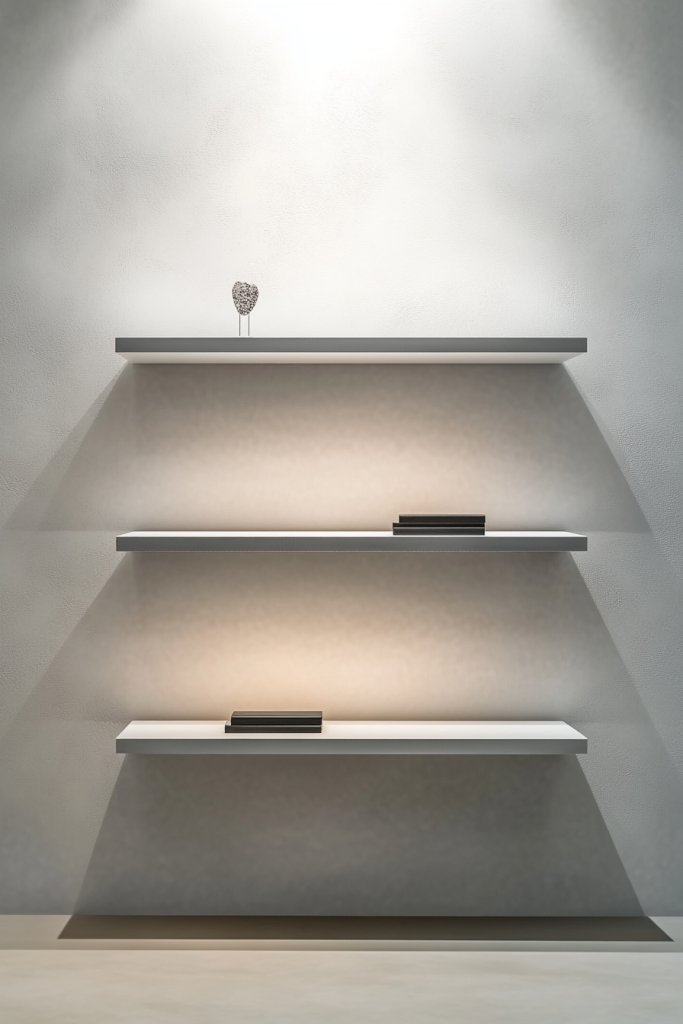 Imagine a set of slim floating shelves mounted against a textured or painted wall, showcasing books, small plants (not necessary if avoiding restricted content), or decorative objects. The clean lines of the shelves contrast beautifully with a bold or subtle background. When well-lit, the shelves cast soft shadows, enhancing the depth and visual interest. It’s a simple yet impactful display technique.
