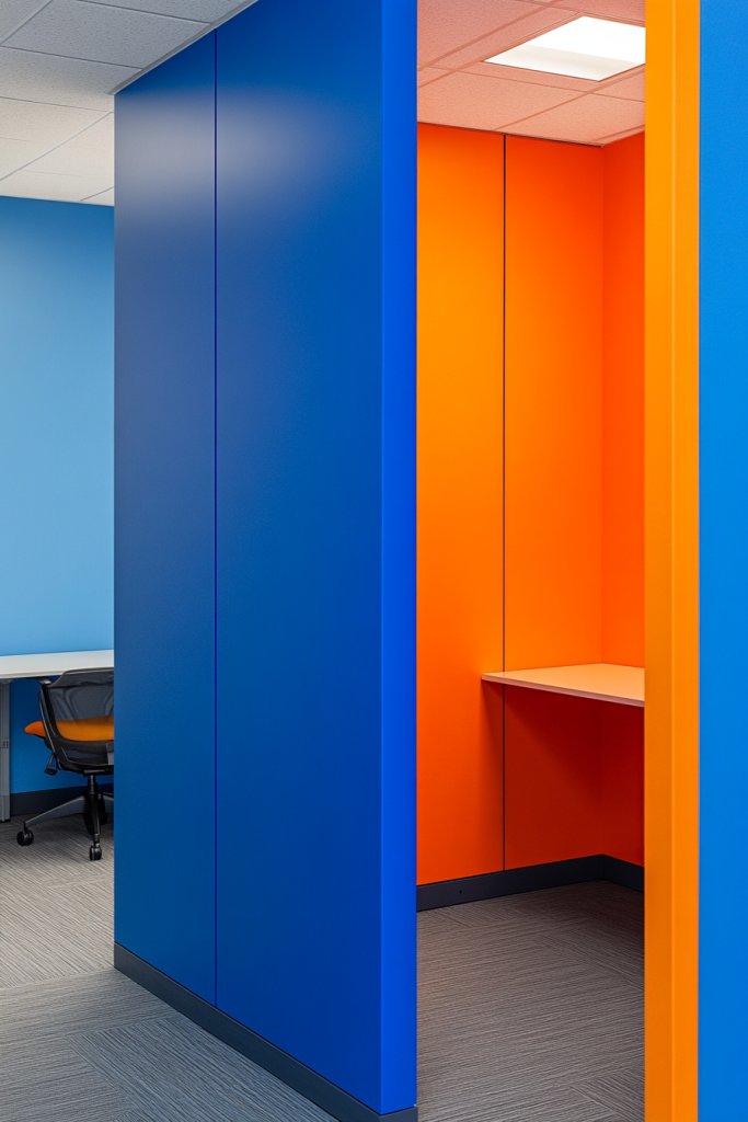 Visualize a wall divided into large, contrasting blocks—like bright teal and warm coral—each defining a different area for work, meetings, or relaxation. The clean, sharp lines of the blocks create a modern, structured look. The vibrant hues reflect light and energize the space, making it feel dynamic and welcoming. This technique transforms plain walls into lively focal points.