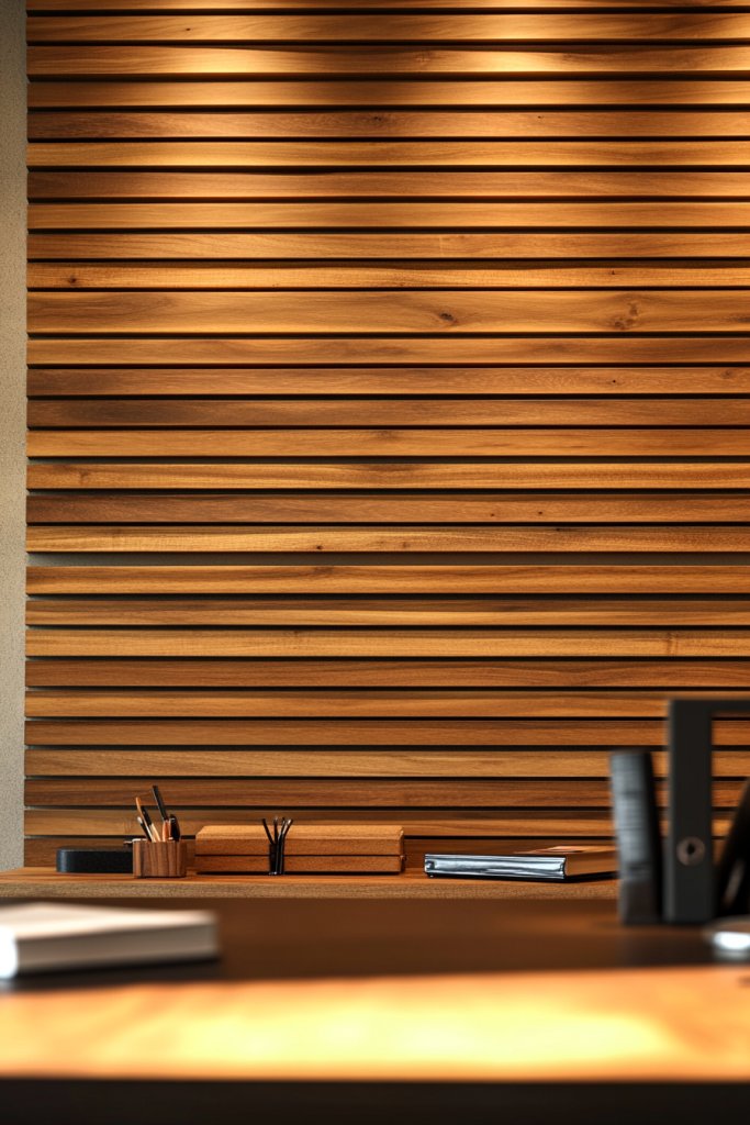 Picture vertical or horizontal wooden slats arranged in a sleek pattern across a wall, in rich oak or warm cedar tones. The natural grain and knots add character, while the clean lines create a modern aesthetic. Light reflects softly off the wood, emphasizing its texture and depth. This feature instantly elevates the ambiance, making your office feel more natural and welcoming.