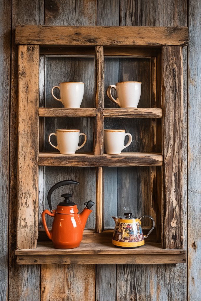 1. Repurposed Window Frame as a Rustic Coffee Bar Display