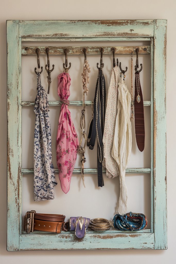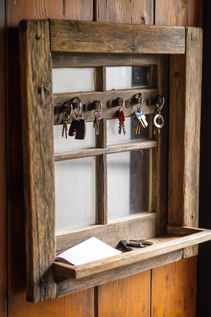 Constantly losing keys or digging through piles of mail? A vintage window frame repurposed as a wall-mounted organizer keeps your essentials in check while adding rustic charm. It’s an easy fix that transforms clutter into a curated display.