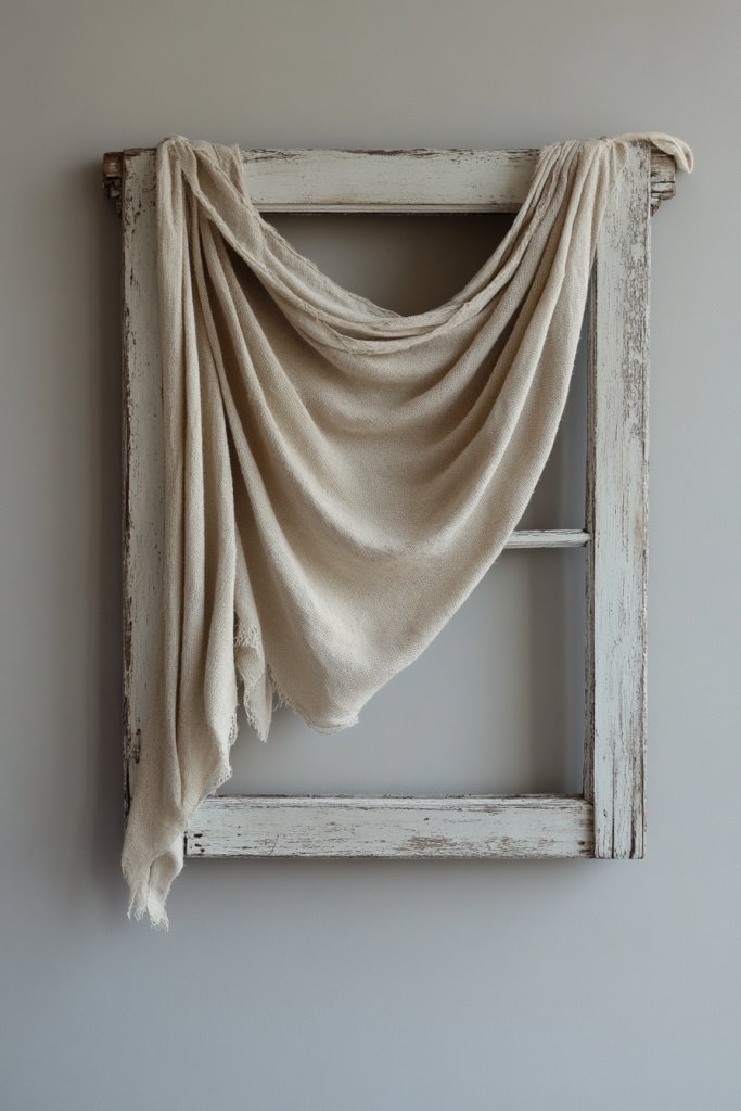 Feeling like your walls lack softness and texture? Using a reclaimed window as a backdrop for fabric or tapestry adds warmth and visual interest without overwhelming your space. It’s an easy way to create a focal point that feels cozy and inviting.