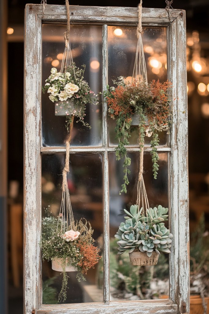 Craving a touch of nature but worried about maintenance? An old window can be transformed into a charming hanging plant display that uses faux or dried arrangements. It’s a low-care option that still brings beauty and a vintage touch to your home.