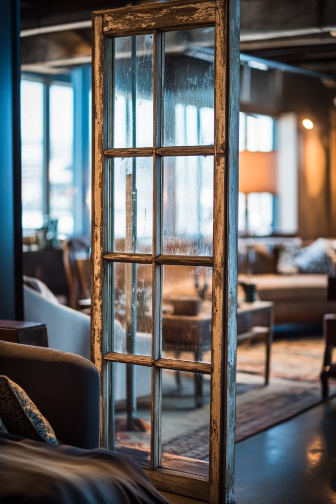 13. Window Frame as a Unique Room Divider with Vintage Charm