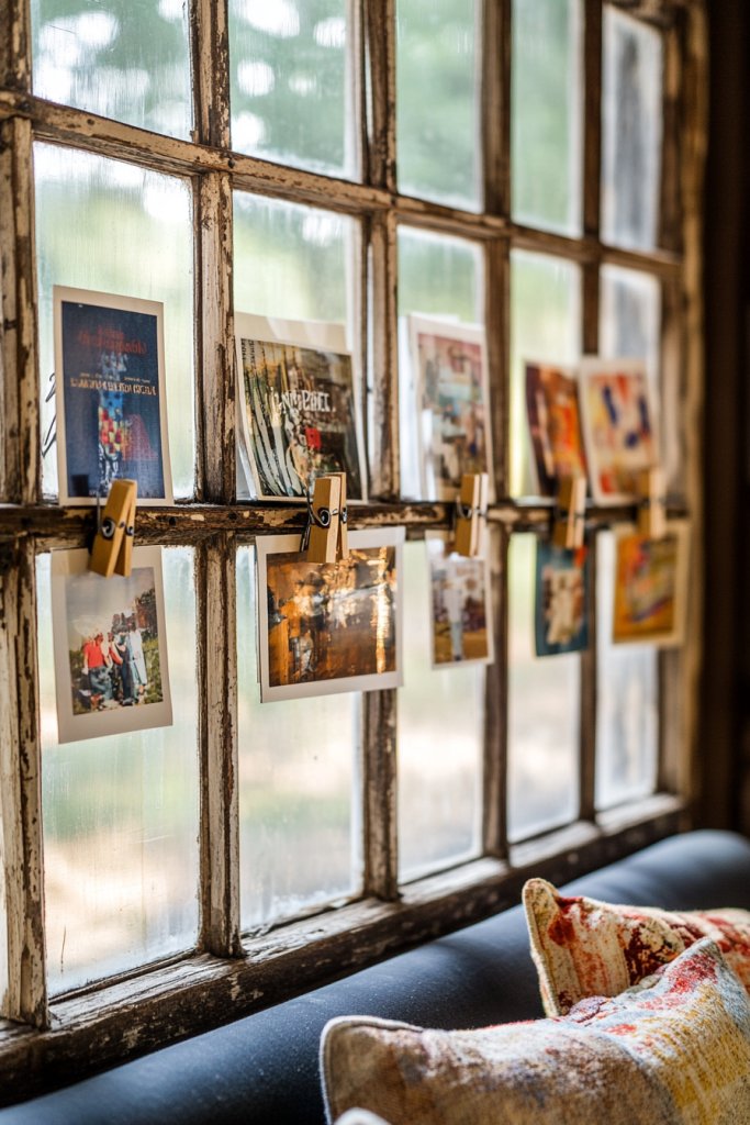Regularly rotate the display to feature new projects or memories, keeping your wall lively. This vintage art display transforms a simple window into a flexible gallery, perfect for creativity and personal expression.