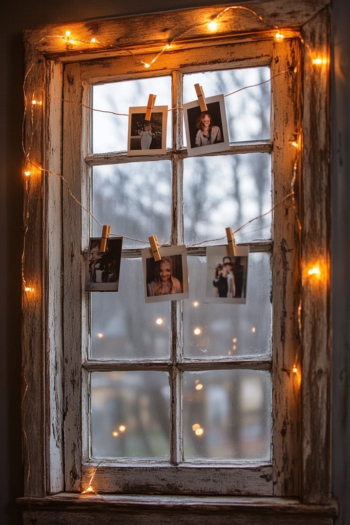 Who says inspiration can’t shine bright? Imagine a weathered window frame hung on the wall, with fairy lights woven through the panes. Photos, notes, or small art pieces are clipped onto strings stretched across the frame, illuminated by the soft glow of the lights.