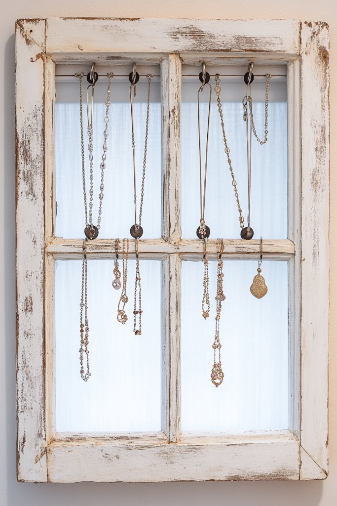 Who knew that such a simple idea could make your mornings less stressful? Imagine a distressed white window frame mounted on the wall, its panes filled with delicate hooks or wires. Necklaces hang in a gentle cascade, earrings dangle from tiny knobs, and bracelets are neatly arranged on twine or wire.