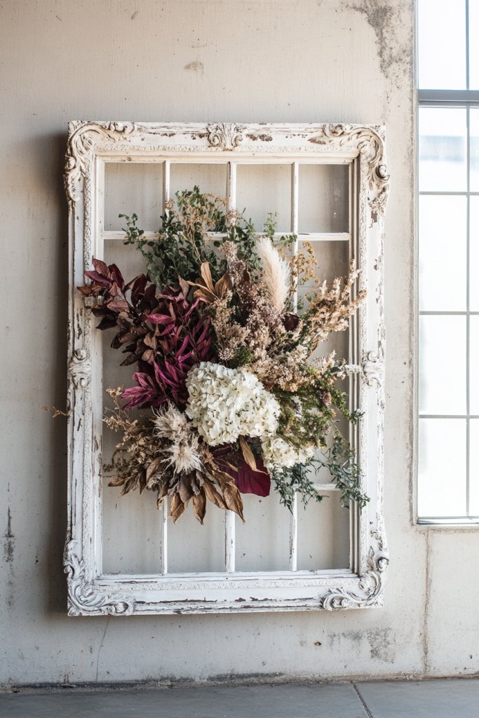 Who says you can’t have a bit of greenery without the upkeep? Picture a vintage window frame mounted on a wall, its panes filled with faux or dried flowers, herbs, or greenery. The arrangement spills out of the frame, creating a lush, layered effect.