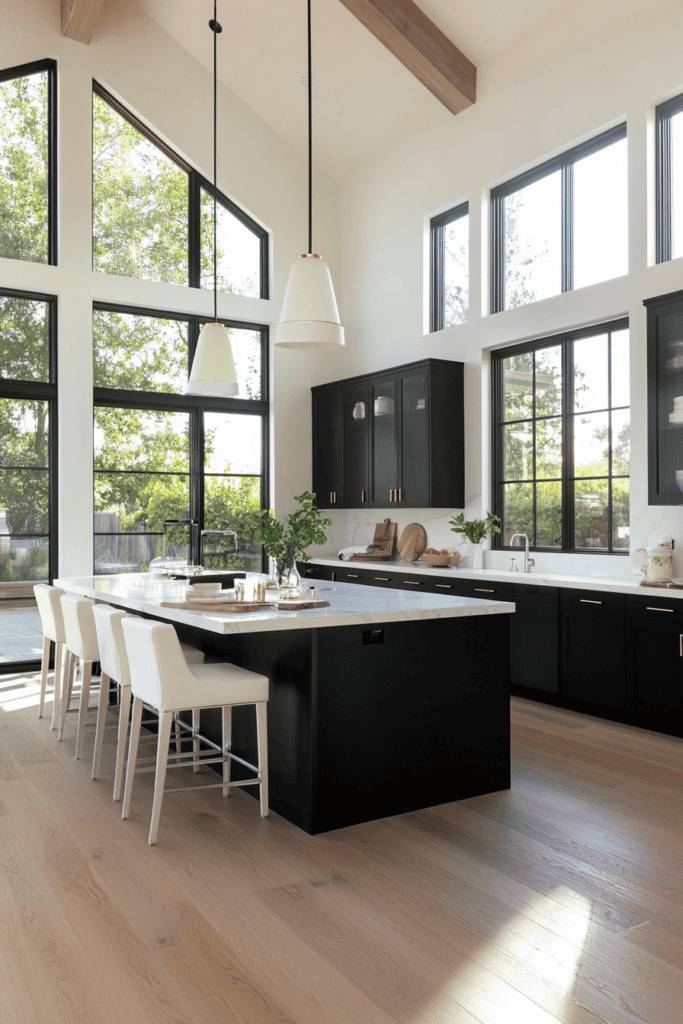 Blending classic elements with a bold flair, stylish black and white contrast can redefine your open kitchen into a striking focal point. Imagine sleek black cabinetry juxtaposed with pristine white countertops, creating a modern yet timeless appeal. This dynamic duo not only enhances the aesthetic but also amplifies natural light, making your space feel larger and more inviting. You can add interest with patterned backsplashes, incorporating geometric designs in either color to elevate the overall look. Don’t forget to include metallic accents—such as brushed gold or chrome—to add a touch of sophistication. With this contrast, you can effortlessly achieve a chic, cohesive design that speaks to your personality while remaining functional for everyday use. It’s all about balance and creativity!
