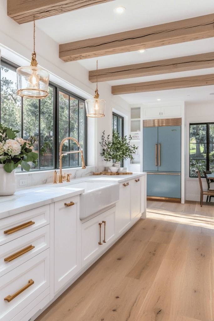 Moving from the sleek lines of modern minimalism, the cozy farmhouse charm offers a heartwarming embrace filled with rustic elegance. Imagine a kitchen where reclaimed wood beams stretch across the ceiling and vintage accessories tell stories of the past. Soft, muted colors create a soothing backdrop, while open shelving displays cherished dishware, inviting you to showcase your personality. A farmhouse sink becomes a centerpiece, effortlessly blending functionality with charm. Inviting textures, like woven baskets and linen curtains, add warmth, making the space feel lived-in and welcoming. Incorporating a large wooden table encourages gathering, turning meal prep into a communal experience. Embrace the cozy farmhouse aesthetic, and you’ll transform your kitchen into a sanctuary of comfort and nostalgia, perfect for creating lasting memories.