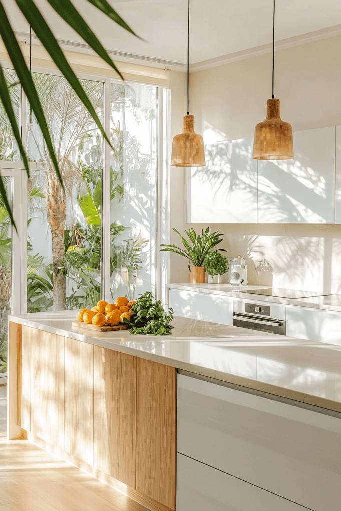 Imagine a kitchen that feels like a sun-drenched villa, where rustic Mediterranean warmth envelops you in a cozy embrace. Picture exposed wooden beams overhead and terracotta tiles underfoot, creating an inviting atmosphere that feels both timeless and trendy. The color palette embraces earthy tones, with creamy whites and soft browns harmonizing beautifully. Open shelving displays handcrafted pottery and olive oil bottles, adding character and charm. A large farmhouse sink invites you to cook with love, while a wooden island serves as a gathering spot for family and friends. Warm, ambient lighting casts a gentle glow, enhancing the homey feel. With its blend of natural materials and inviting designs, this kitchen style effortlessly brings the beauty of the Mediterranean into your home.