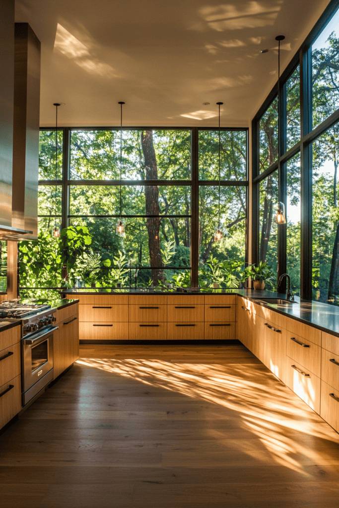Incorporating nature-inspired designs into your open kitchen can create a serene and rejuvenating atmosphere, seamlessly blending indoor and outdoor elements. Imagine warm wood finishes, stone countertops, and lush greenery that invite the beauty of nature indoors. Opt for large windows or glass doors to flood your space with natural light and provide views of your garden or patio. You might consider adding herb planters or a vertical garden to not just enhance aesthetics but also provide fresh ingredients at your fingertips. Earthy color palettes, like soft greens and warm browns, can evoke a calming vibe. With thoughtful touches, your kitchen can become a tranquil oasis, promoting well-being while you whip up your favorite meals.