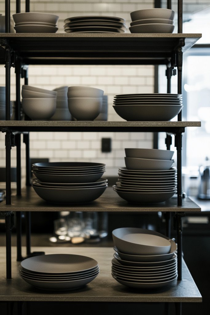 Picture raw metal brackets supporting reclaimed wood or matte black shelves, with matching matte dishes and utensils neatly arranged. The contrast between metal and matte finishes creates a striking visual impact. The textures add depth, while the overall look exudes industrial sophistication. Ambient lighting enhances the tough yet elegant vibe.