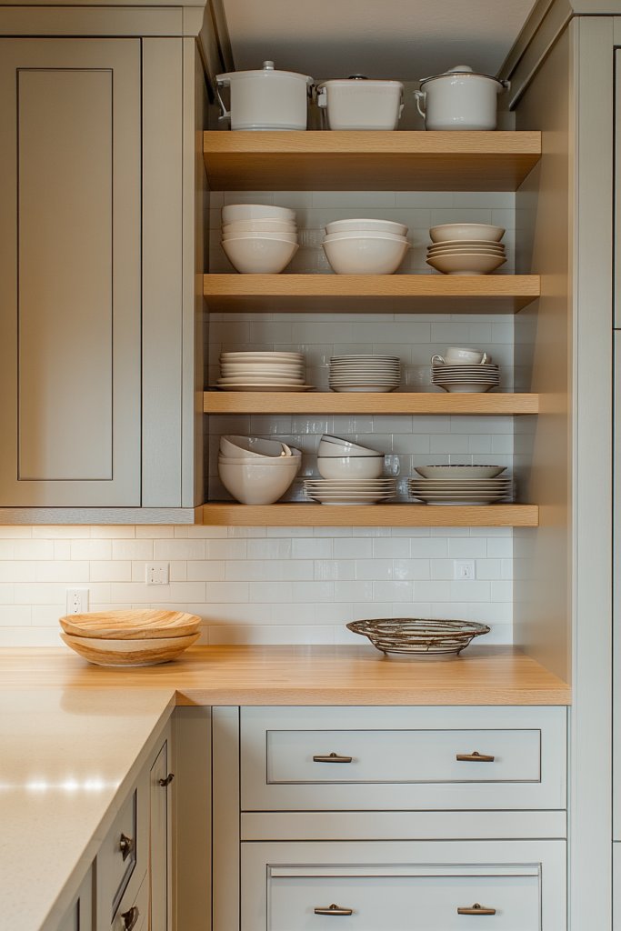 Visualize a wall with open shelves displaying beautiful dishware, while nearby cabinets hide less attractive appliances or supplies. The mix provides visual interest without clutter, with the open areas acting as a gallery. Soft lighting highlights the displayed items, creating a dynamic yet harmonious space. It invites both practicality and style.