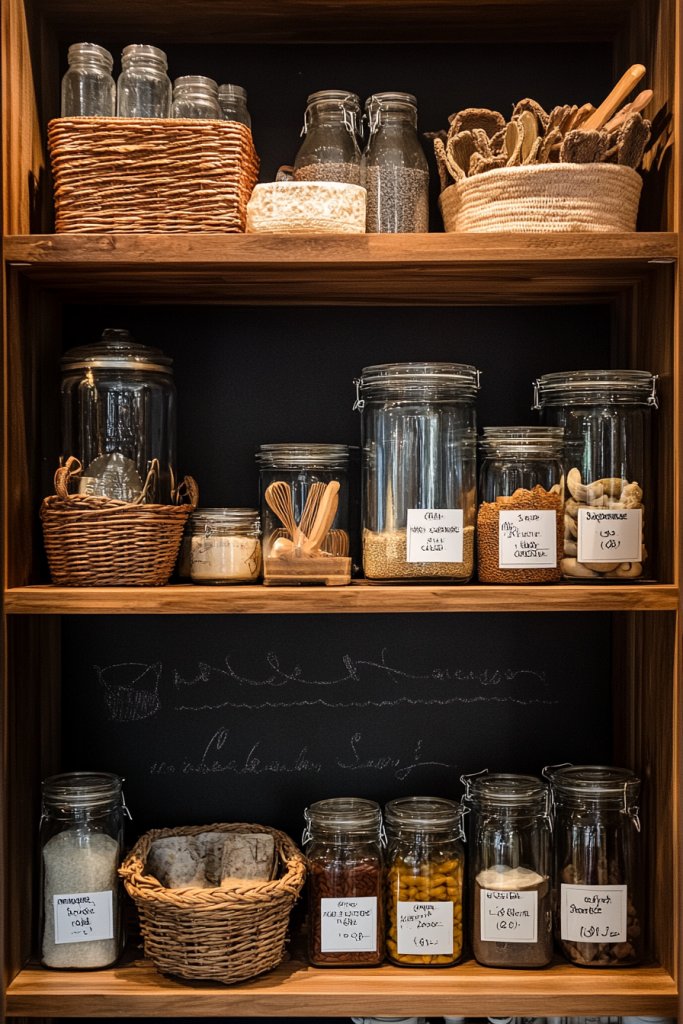 Imagine open wooden shelves with a chalkboard surface on the back, decorated with handwritten labels and doodles. Jars of grains, spices, or snacks are neatly arranged, with chalk markings indicating contents. The contrast between the dark chalkboard and colorful items creates a lively, engaging look. It feels playful and functional.