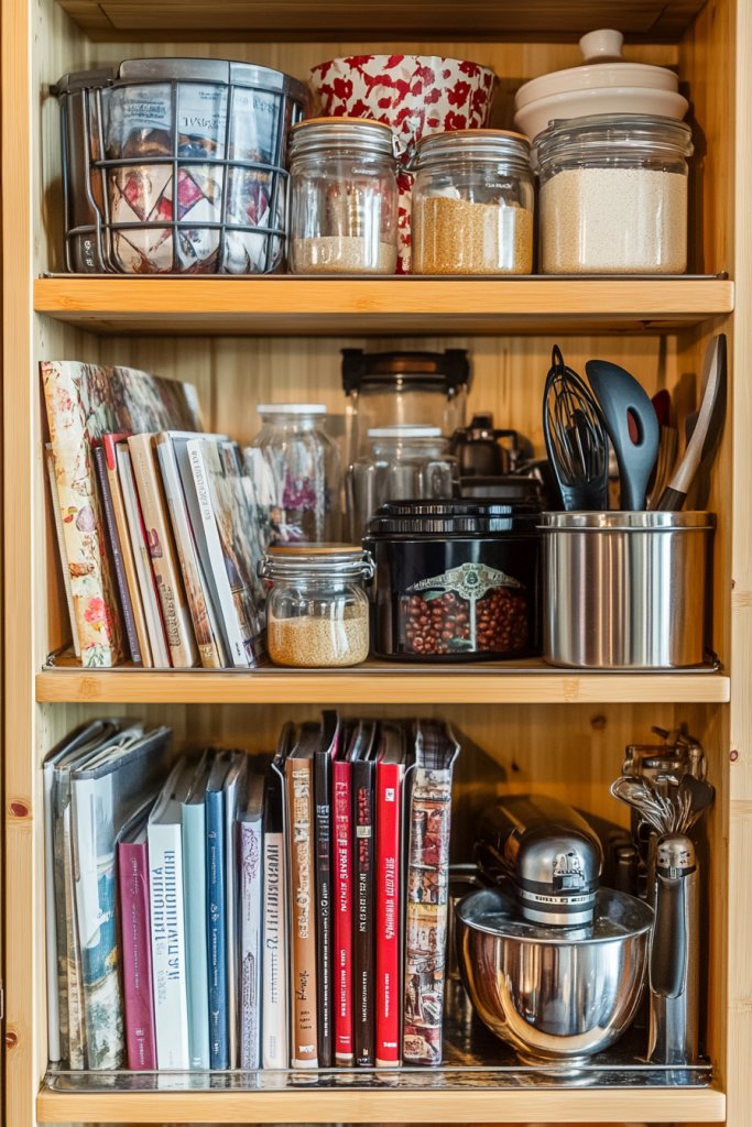 Do your cookbooks and kitchen tools hide in drawers or cluttered cabinets? Multi-tiered shelves turn these essentials into eye-catching displays. They add vertical interest and make everything easy to see and access. If you want your kitchen to feel both functional and stylish, this idea is worth exploring.