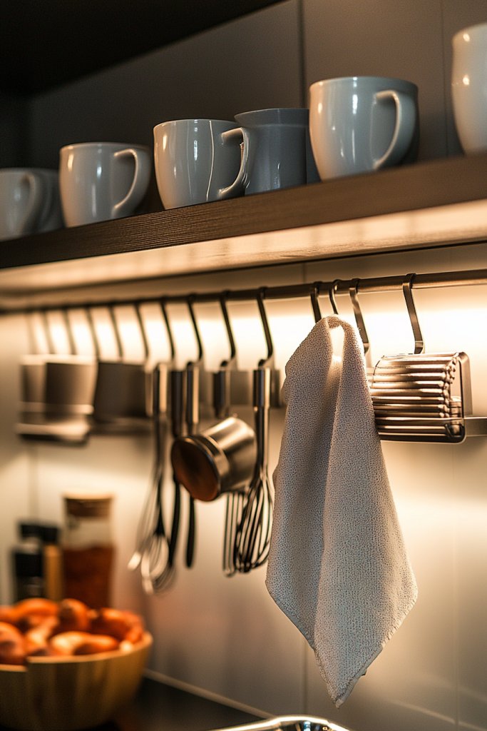 Securely attach hooks directly beneath sturdy shelves with appropriate anchors or screws. Arrange mugs and utensils by color or size for visual harmony. Leave enough space between hooks for easy hanging and removal. Regularly clean and check the hardware for safety. Consider a removable or adjustable hook system for flexibility.