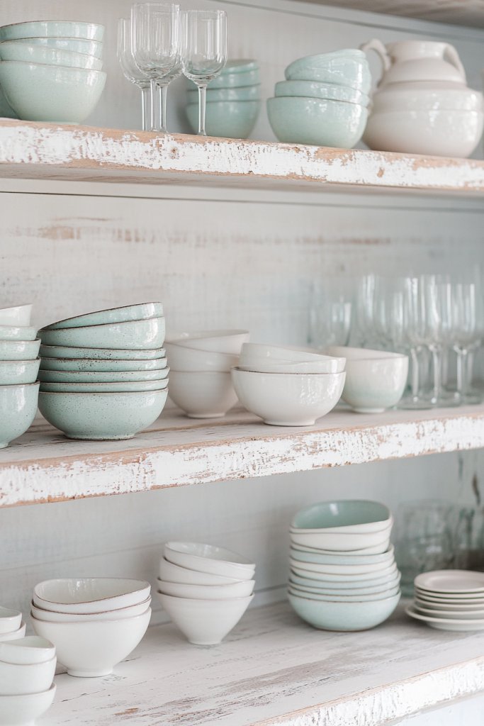 Select shelves with a distressed or vintage finish and secure them firmly to the wall. Arrange the dishes in groups of similar shades for a harmonious look. Keep the space uncluttered and regularly dust to maintain brightness. Consider sealing or waxing to preserve the whitewashed finish. Use gentle lighting to enhance the airy feel.