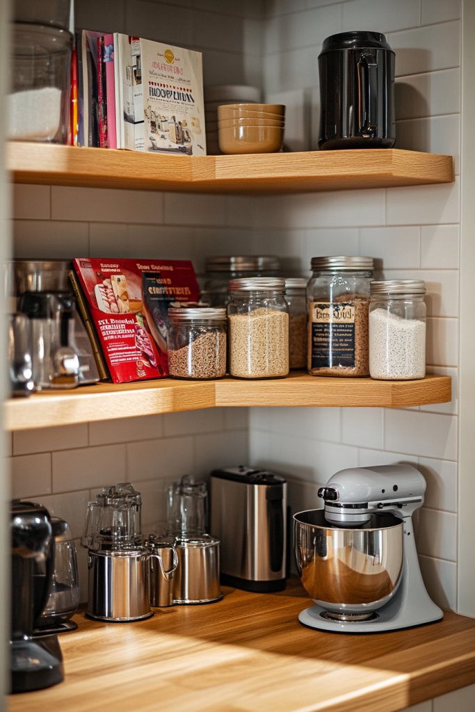 1. Corner Shelving Units to Maximize Space and Display Cookbooks and Small Appliances
