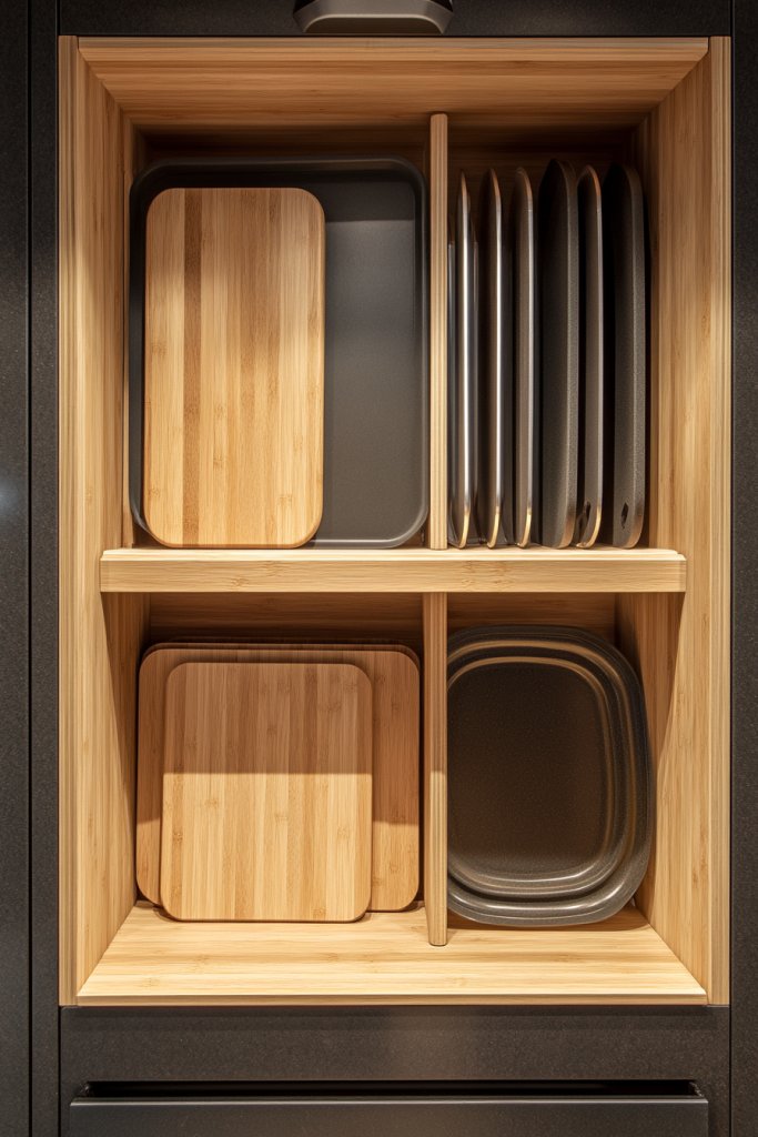Visualize a sleek shelf with vertical dividers made of wood or metal, holding baking sheets and cutting boards in separate slots. The clean, organized look makes grabbing your tools quick and effortless. The dividers add structure, preventing items from slipping or falling over, while creating a visually pleasing pattern. The space feels orderly yet accessible.