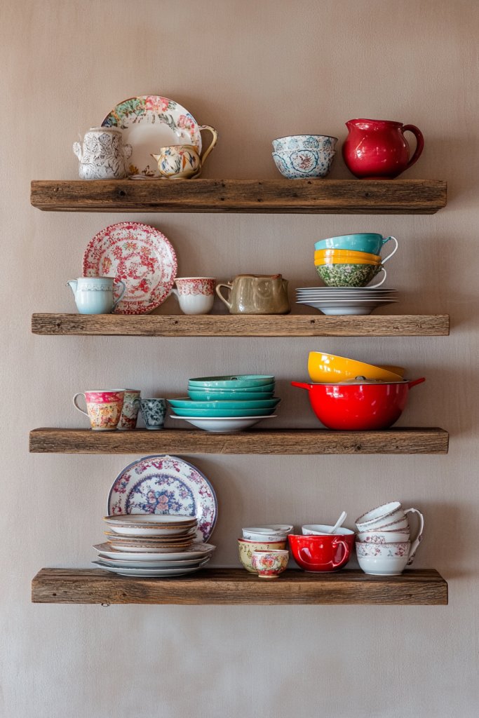 Imagine thick, reclaimed wood shelves with natural knots and rough edges, mounted seamlessly to the wall. Bright, mismatched dishware in cheerful hues sits atop, creating a lively, inviting display. The textures contrast beautifully—smooth ceramics against rugged wood—adding depth to your space. Soft light bounces off the glossy surfaces, making the colors pop.