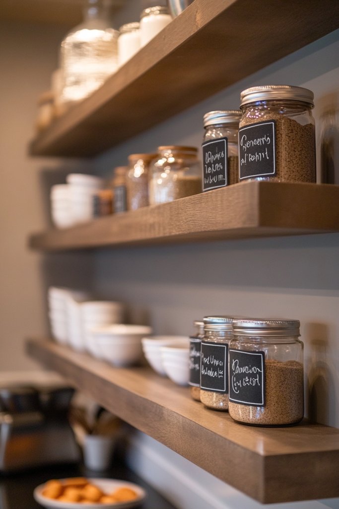 9. Floating Shelves with Built-In Chalkboard Labels