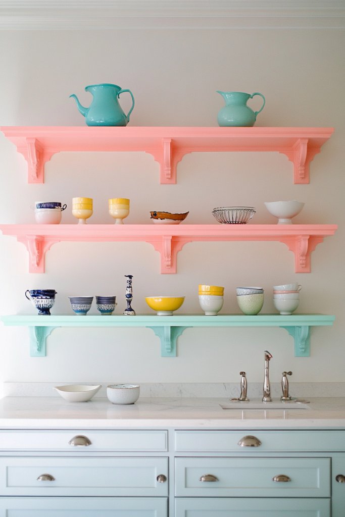 Picture a series of shelves in a soft pastel shade, layered at different heights, with colorful dishware and accessories arranged to create depth. Textured textiles, like woven baskets or patterned cloths, complement the palette and add visual interest. Items are grouped by color or theme, forming a cohesive, colorful display. Soft lighting enhances the hues, making the space cheerful and lively.
