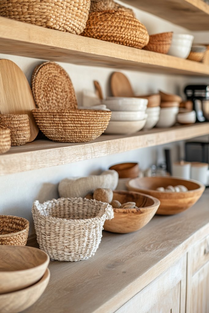 11. Open Shelves with Natural Elements and Textured Materials