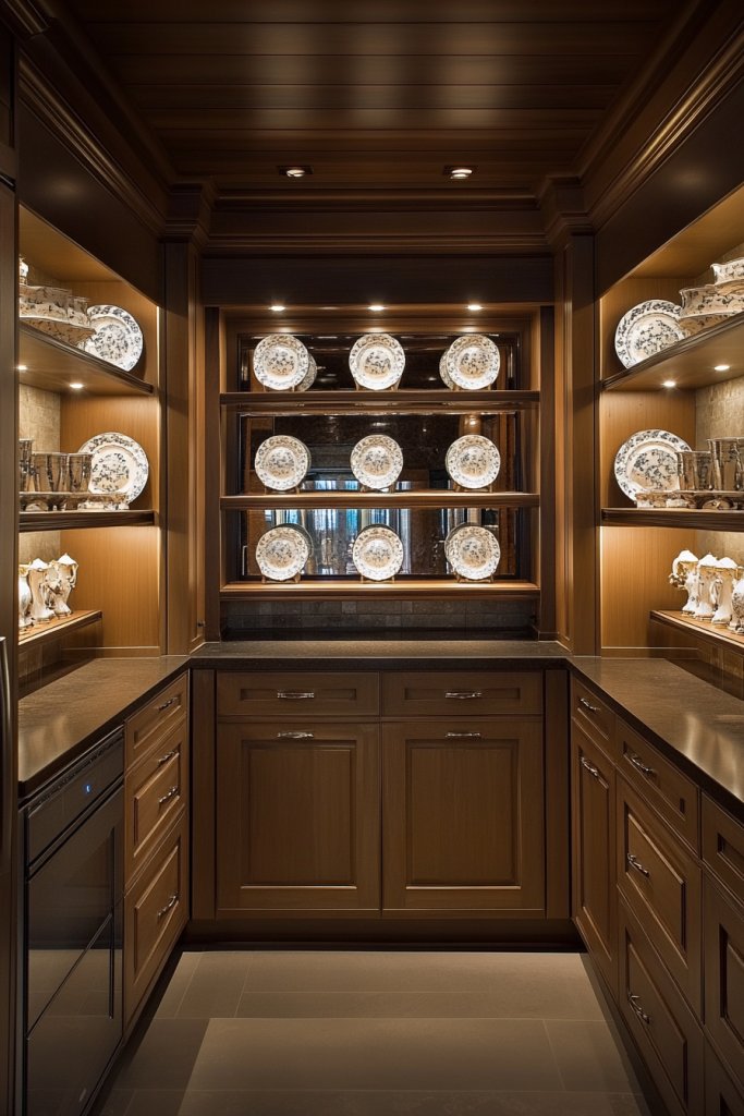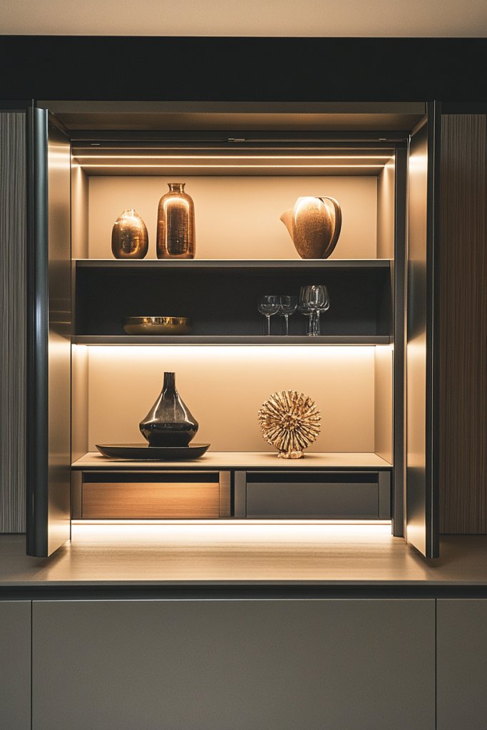 Visualize open shelves displaying curated dishes, glassware, or decor, with concealed cabinets or drawers underneath. The hidden storage keeps clutter out of sight, maintaining a clean and modern look. The open displays are thoughtfully arranged, emphasizing style, while the concealed spaces hide less attractive items or bulk supplies.
